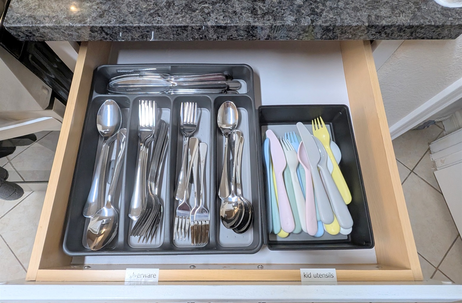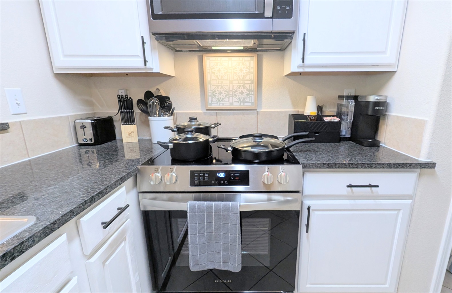 The fully equipped kitchen includes cookware, dishware (including kid-friendly options), basic spices, and appliances like a k cup coffee maker, toaster, blender, and more. Whether you're prepping quick breakfasts or full family dinners, everything you need is right here.