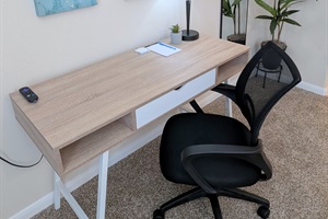 Workers can utilize the desk workspace stocked with complimentary notepads, pens, tape, and scissors as well as easy to access electrical outlets.