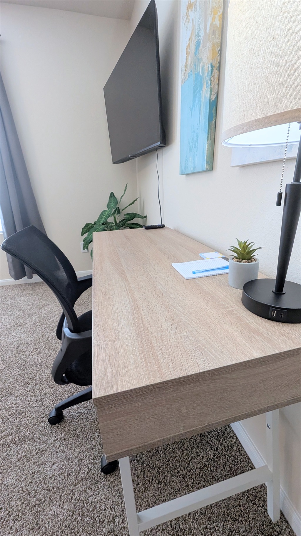 Workers can utilize the desk workspace stocked with notepads, pens, tape, and scissors as well as easy to access electrical outlets.