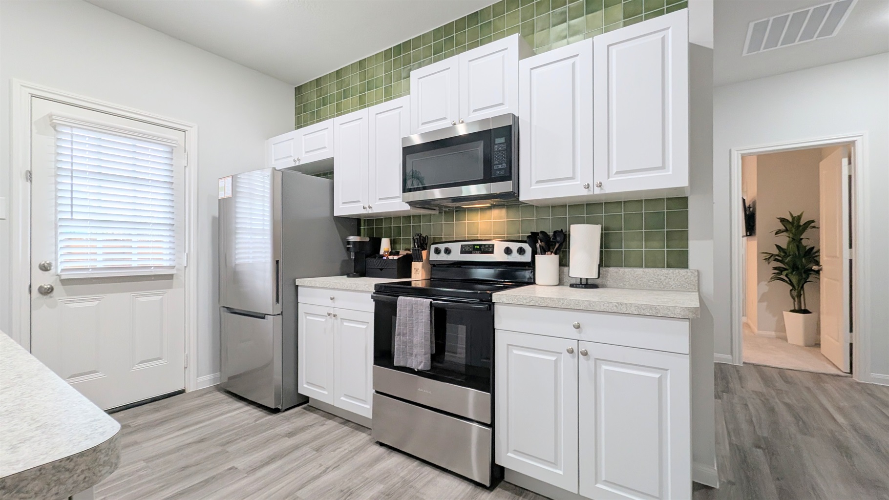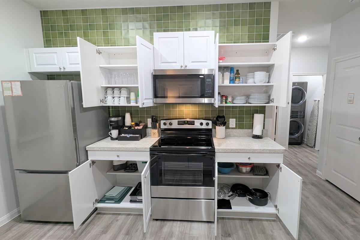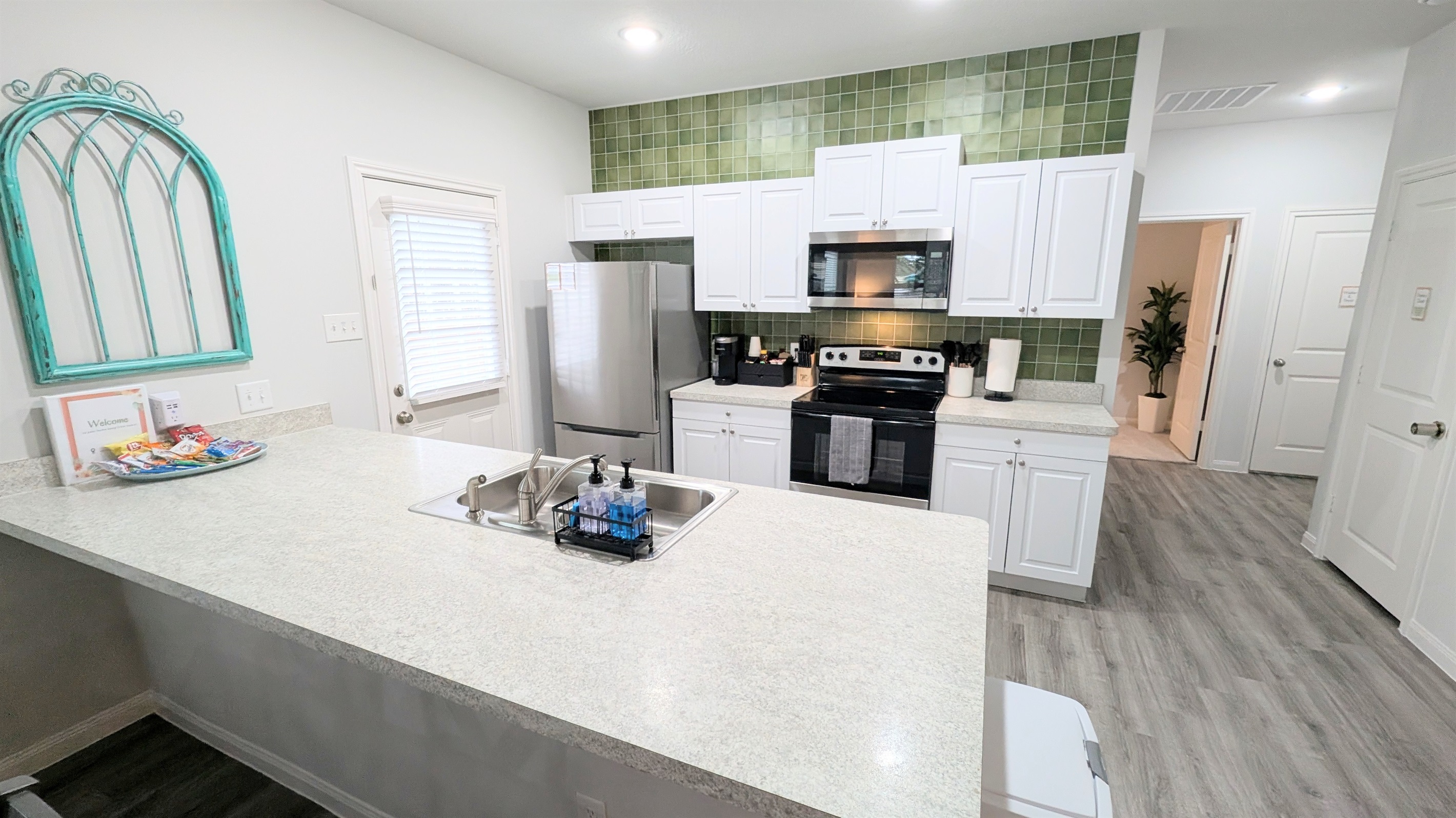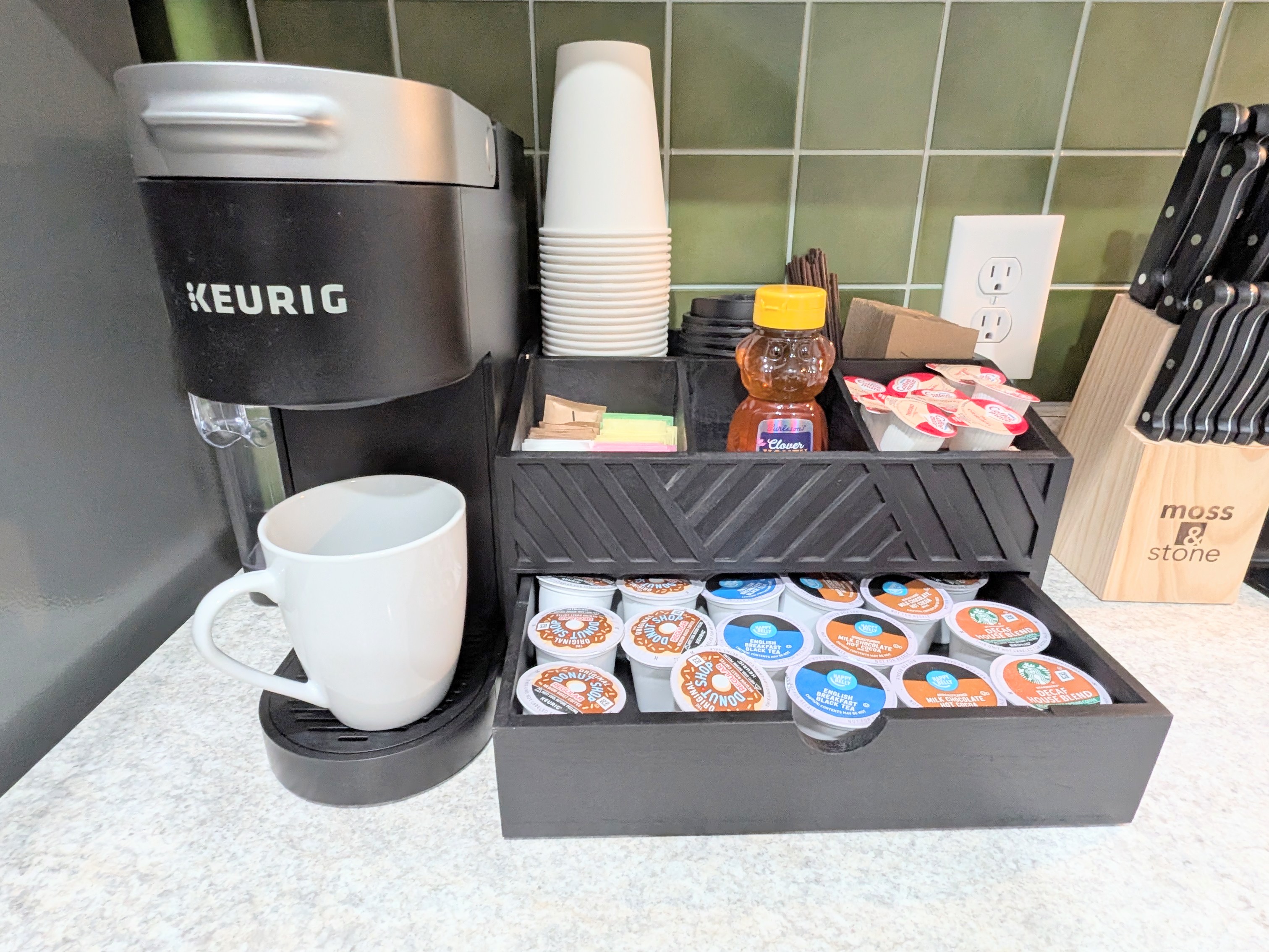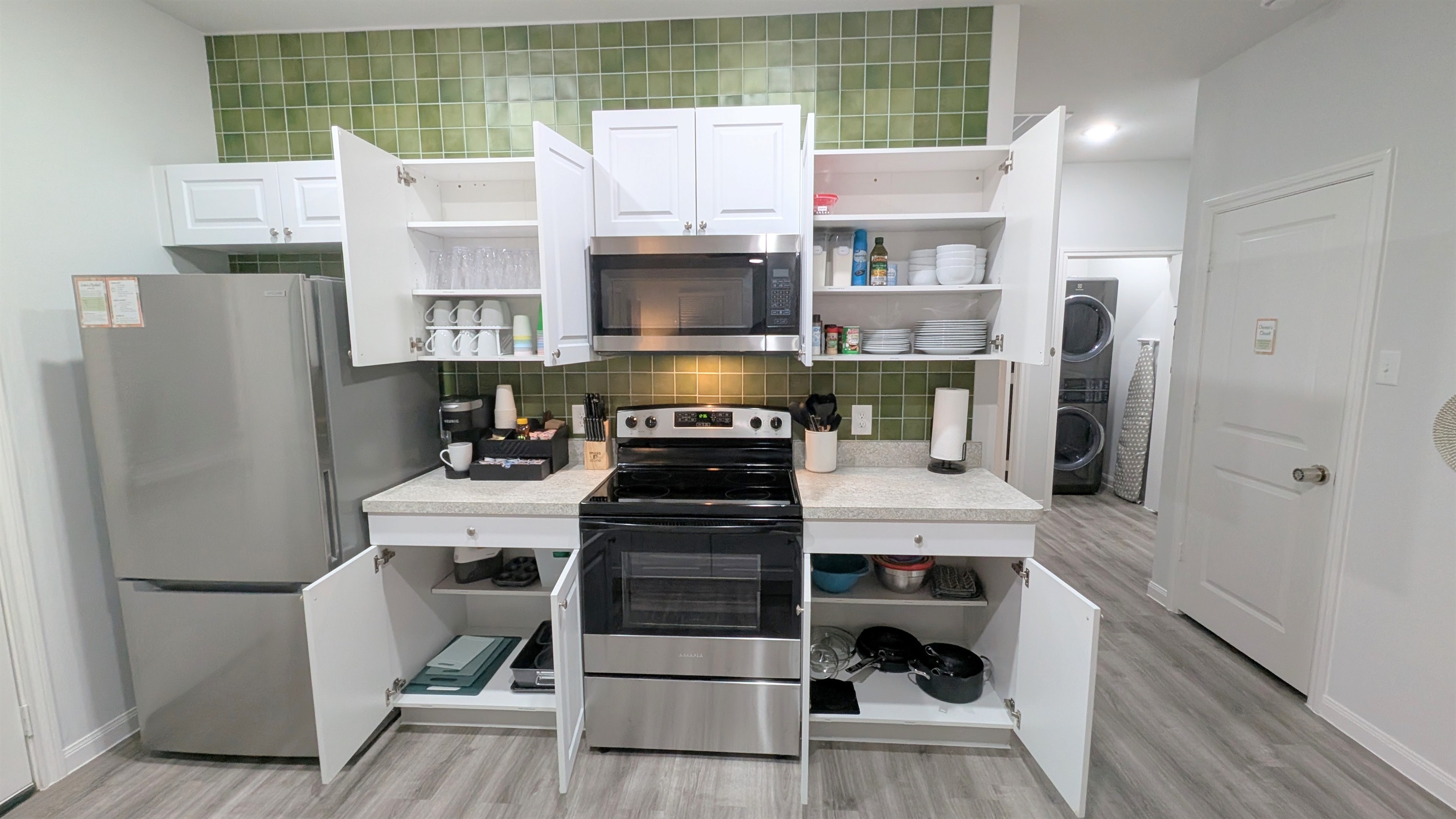 This fully stocked kitchen has a stove/oven, microwave, k-cup coffee maker, dishwasher, refrigerator, and plenty of space to make a delicious meal.