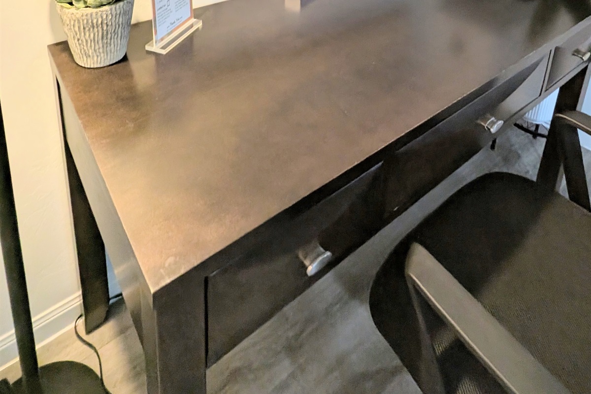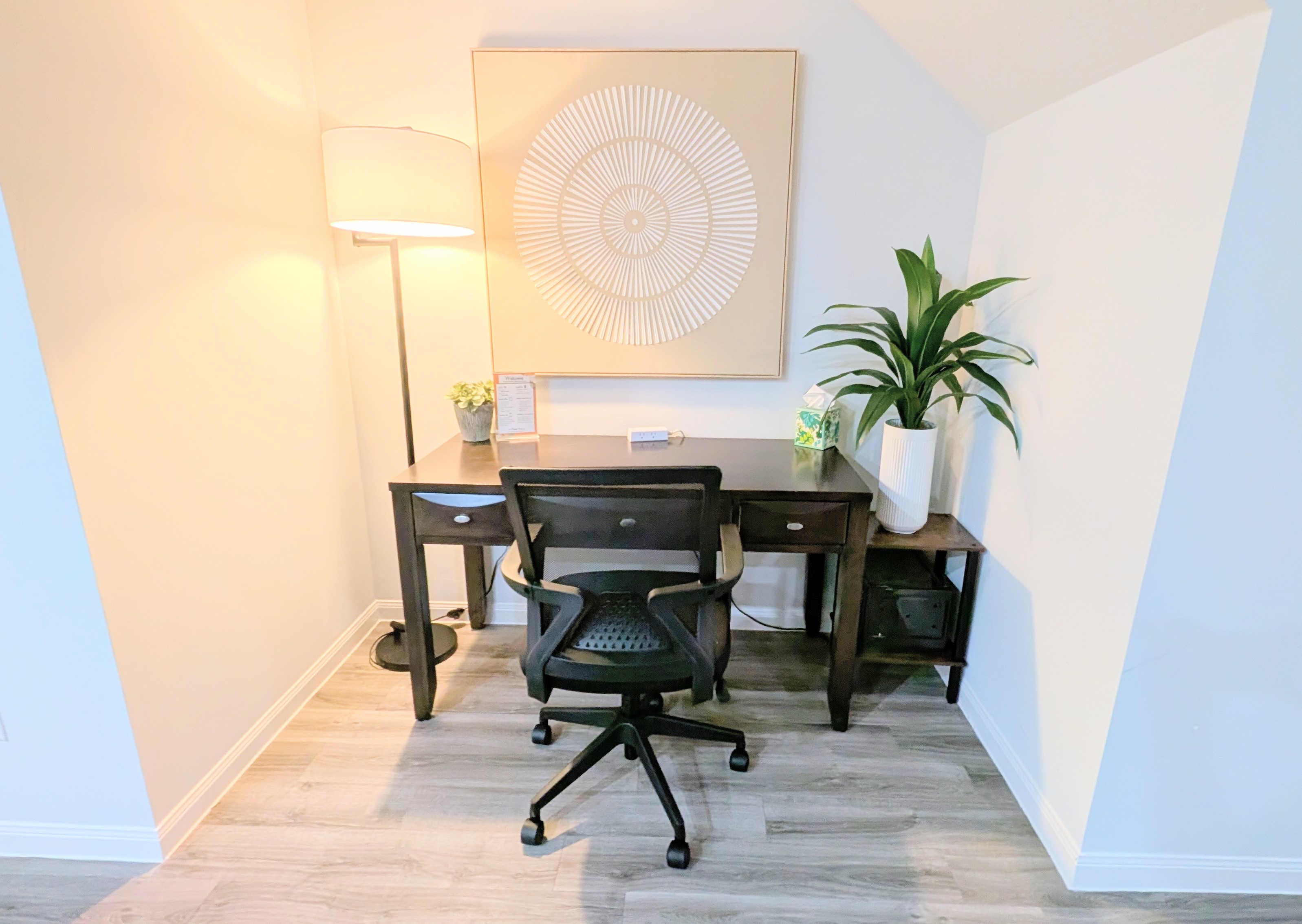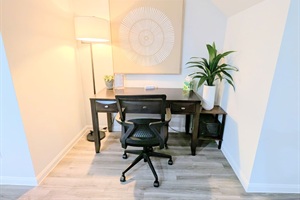 This work space nook includes WiFi access, easy charging ports and a full size desk for your work needs.
