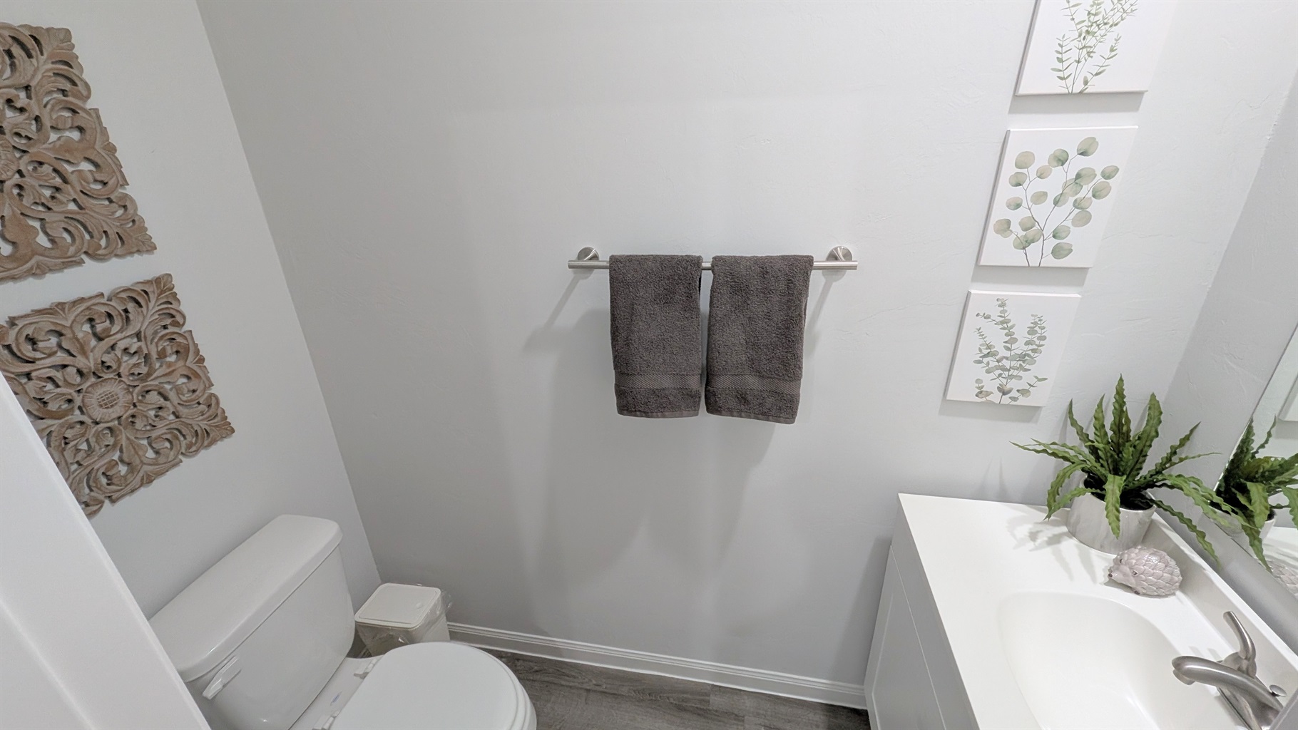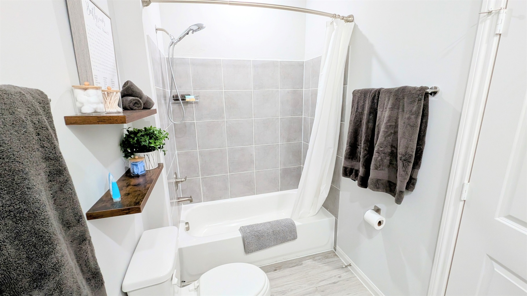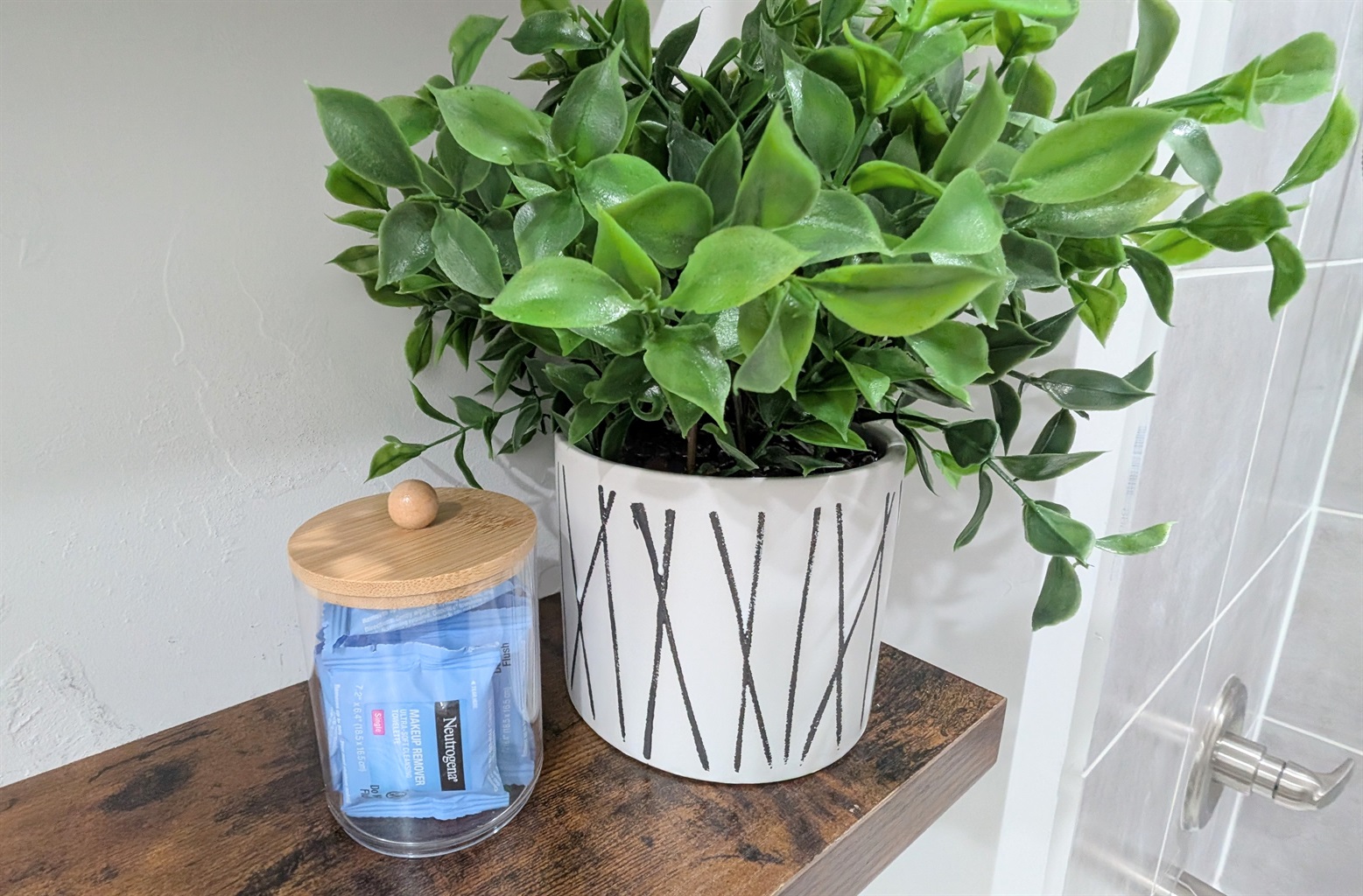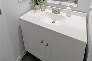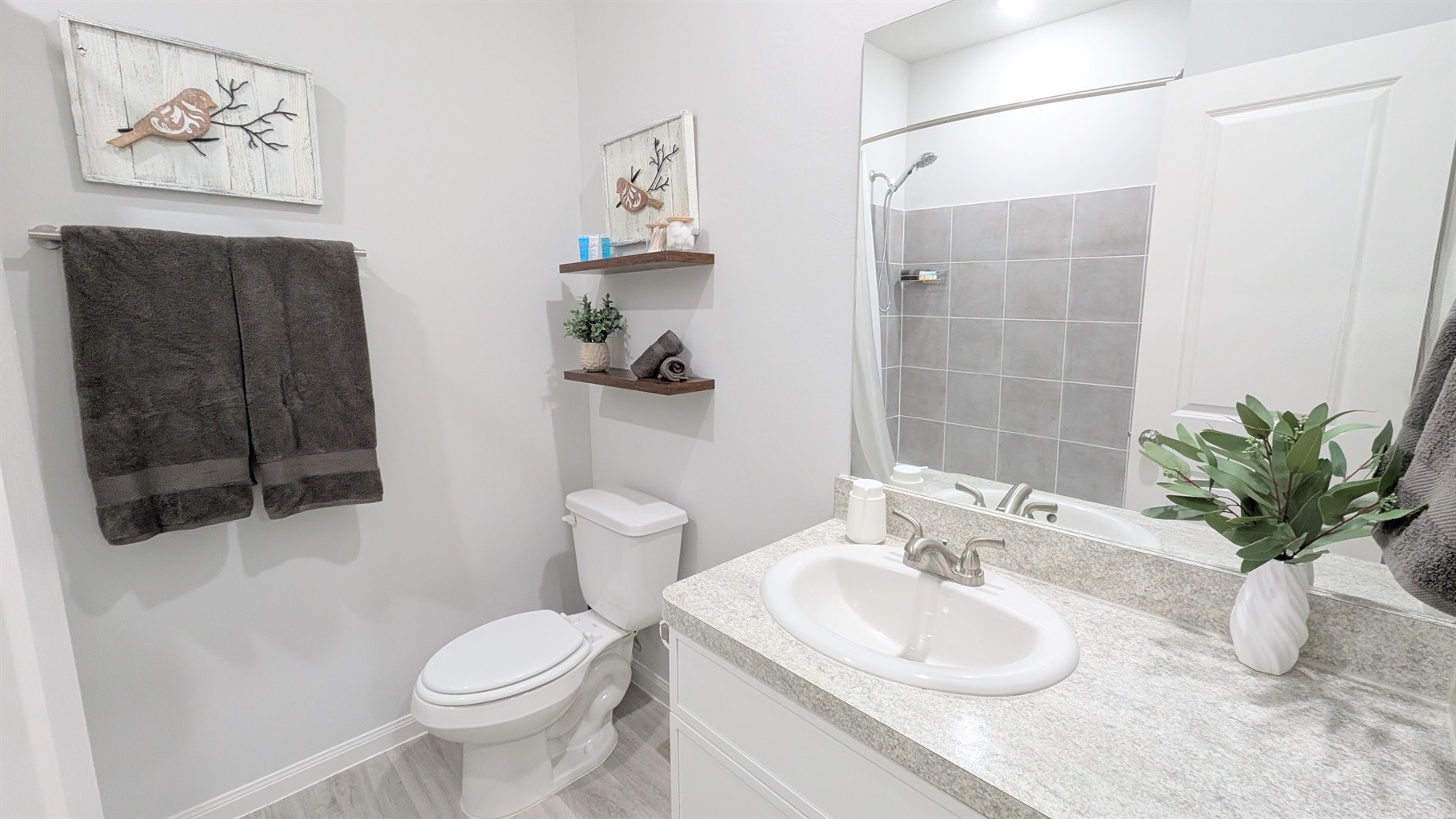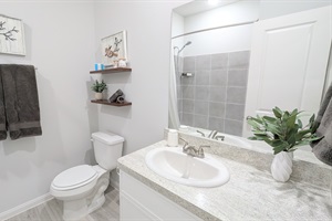 En suite bathroom located off the primary bedroom is fully stocked with fluffy towels, basic toiletries, and all the comforts of home.