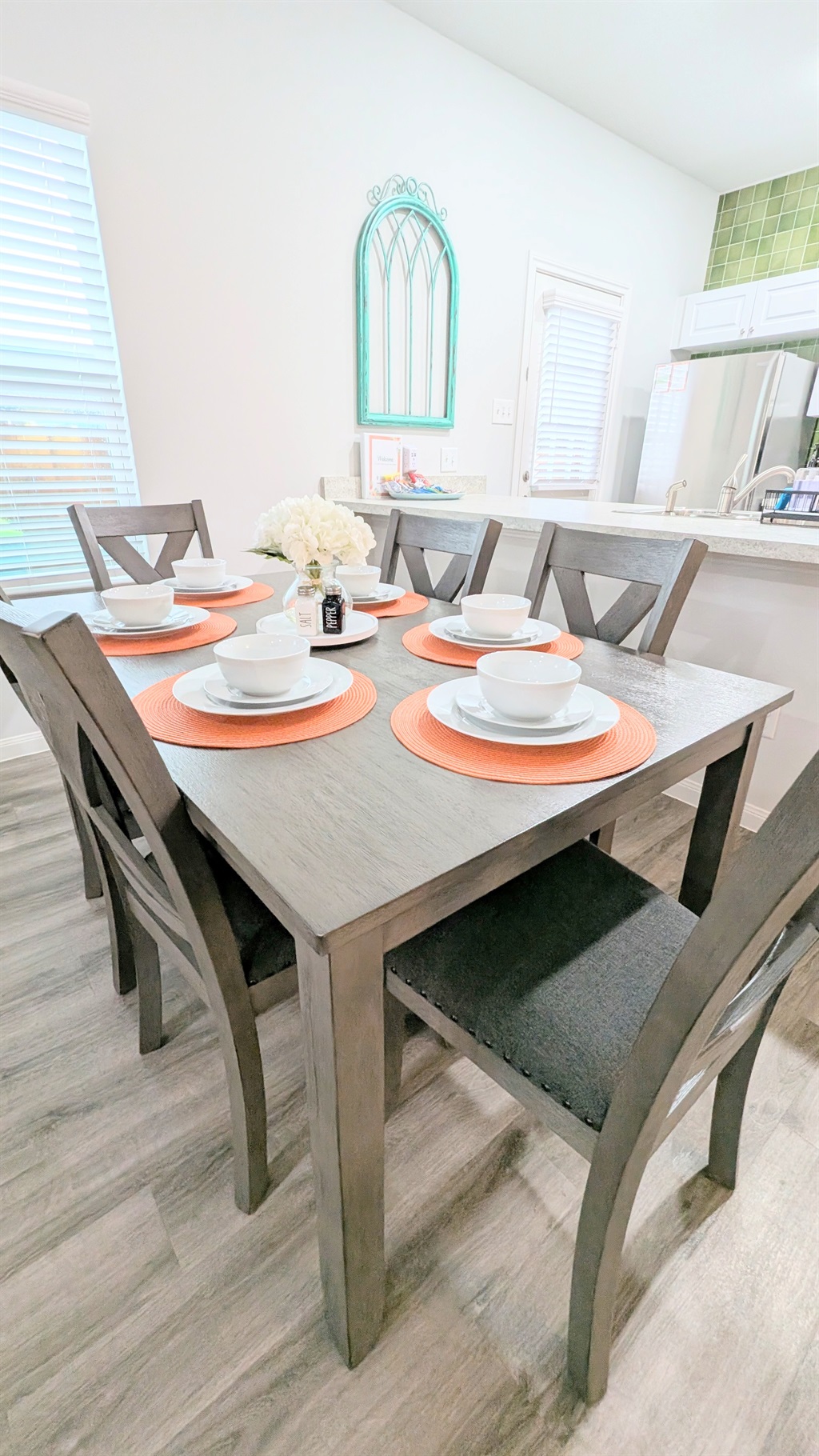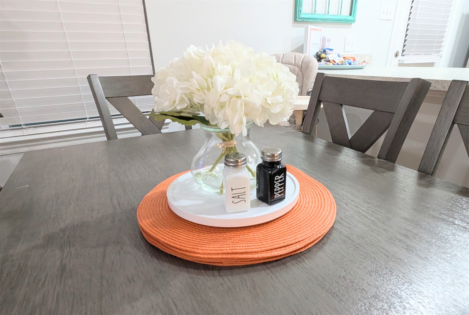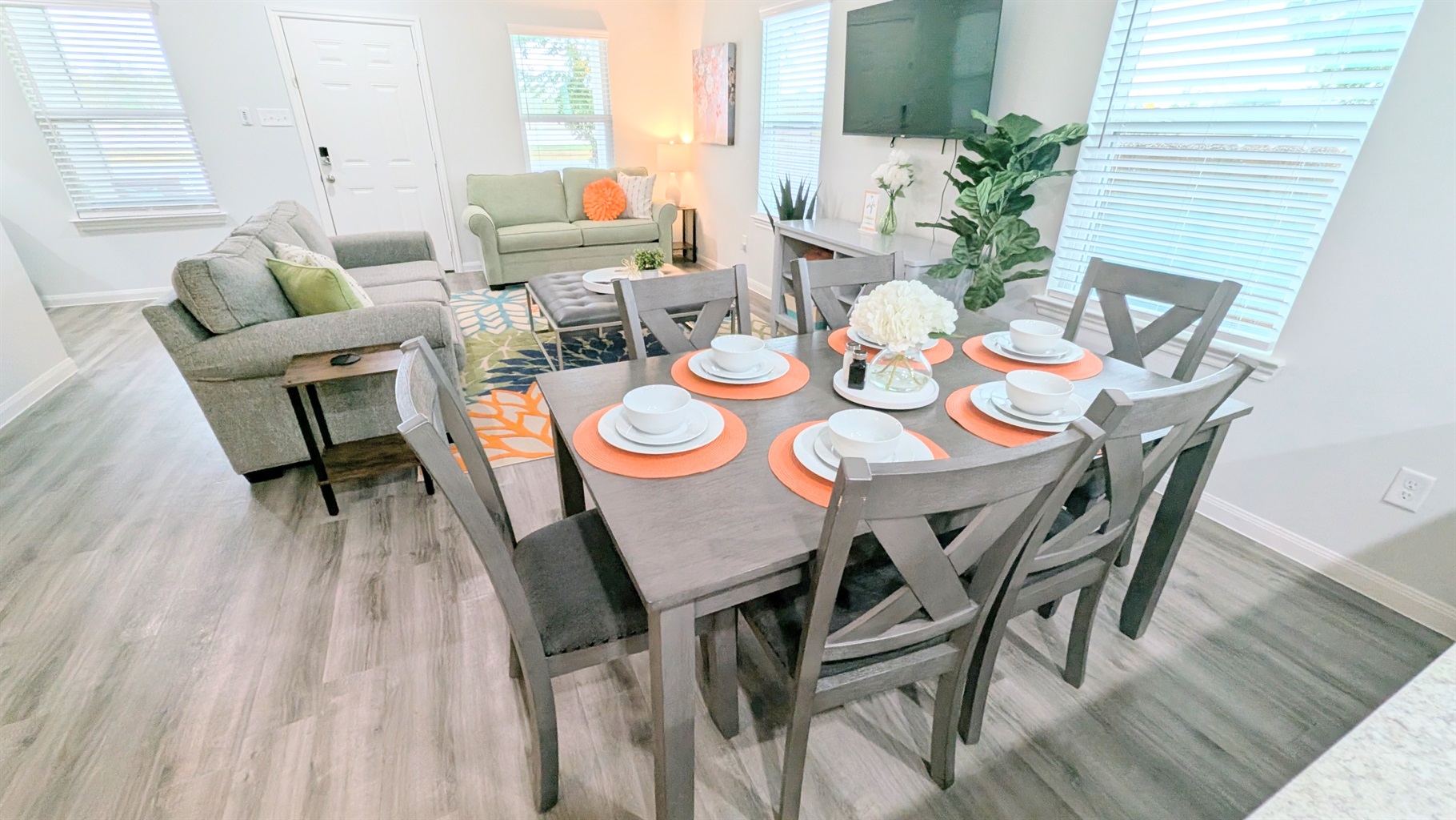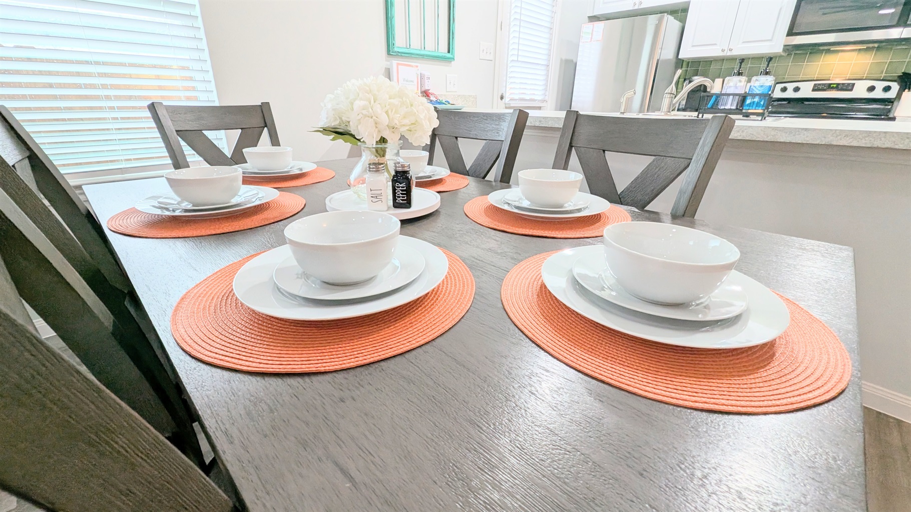 Conveniently located in the open concept living space, this dining space has room for your group.