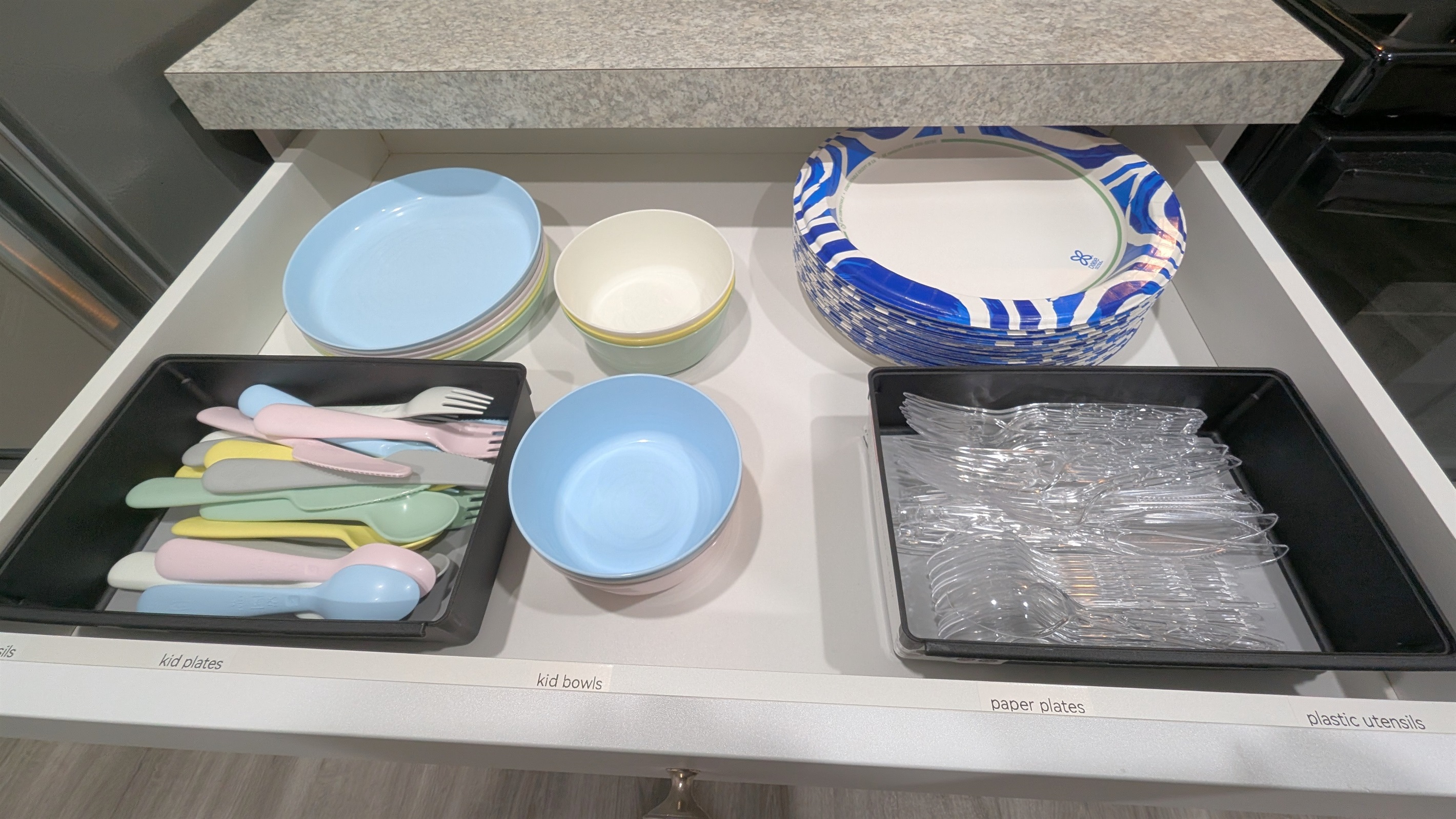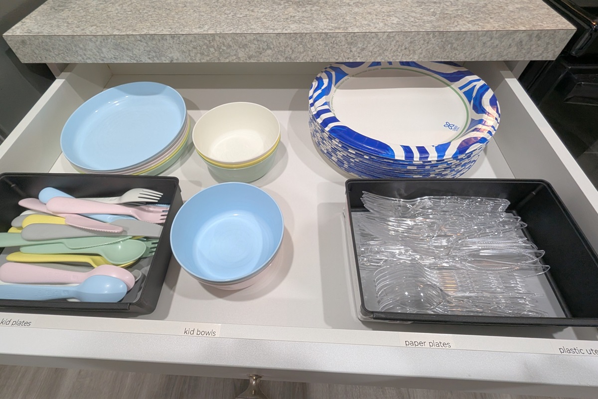 Kid friendly plates & utensils, as well as paper plates and plastic utensils are stocked.