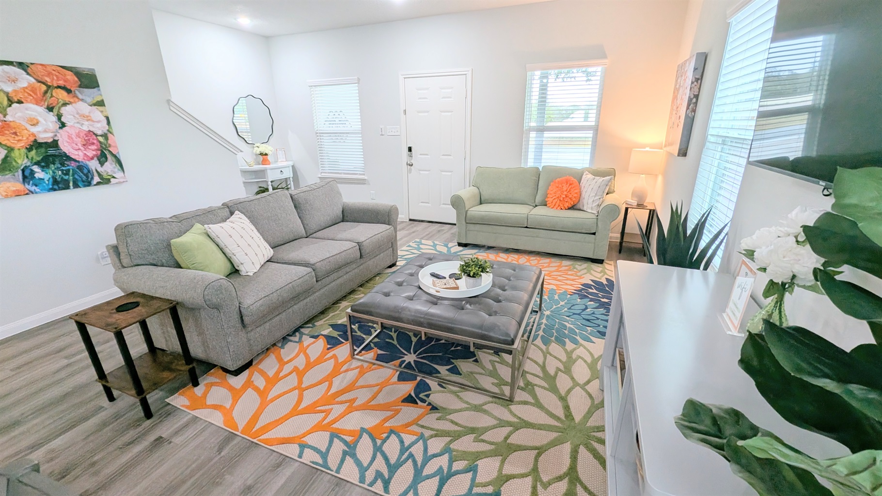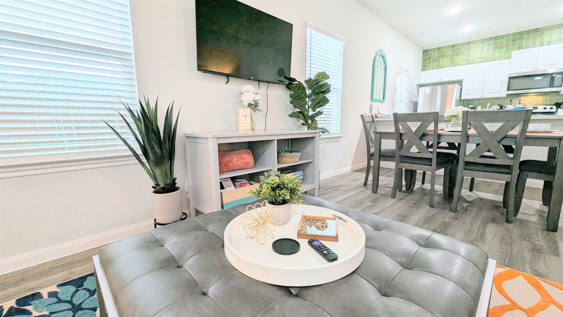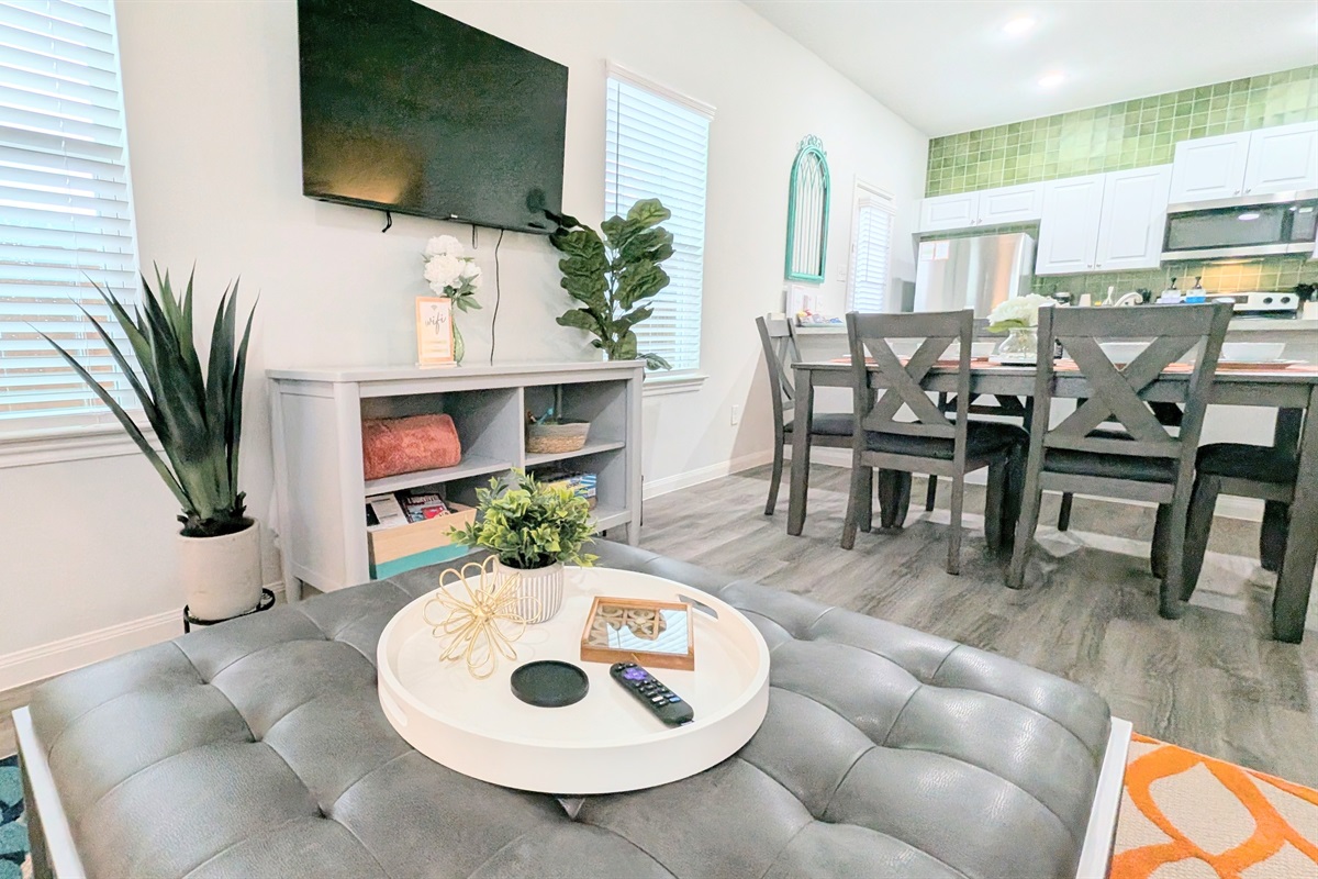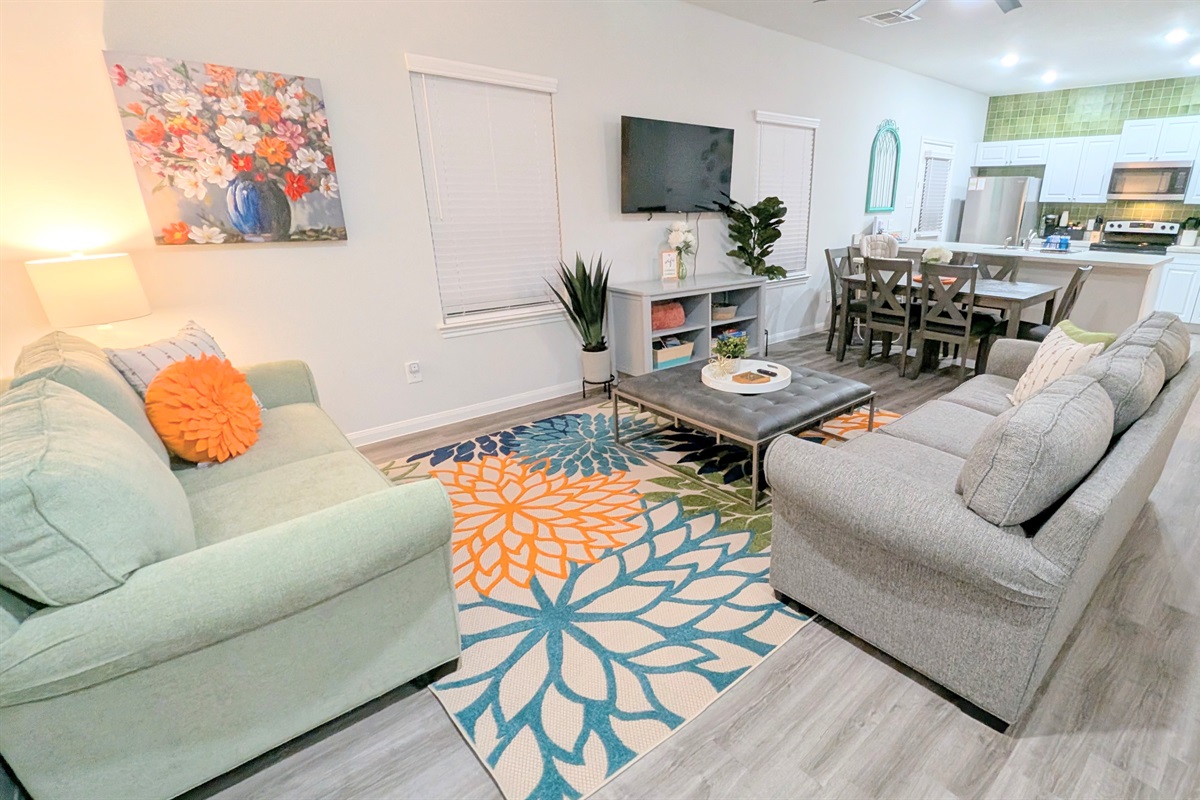 Cozy living room with two couches, ottoman, and open concept access to the dining area. Relax while watching the Roku smart TV or play some board games with the family.
