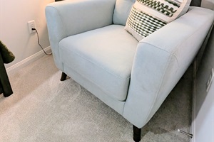 Twin beds for extra sleeping space and flexibility and a comfy reading nook are located in this upstairs bedroom.