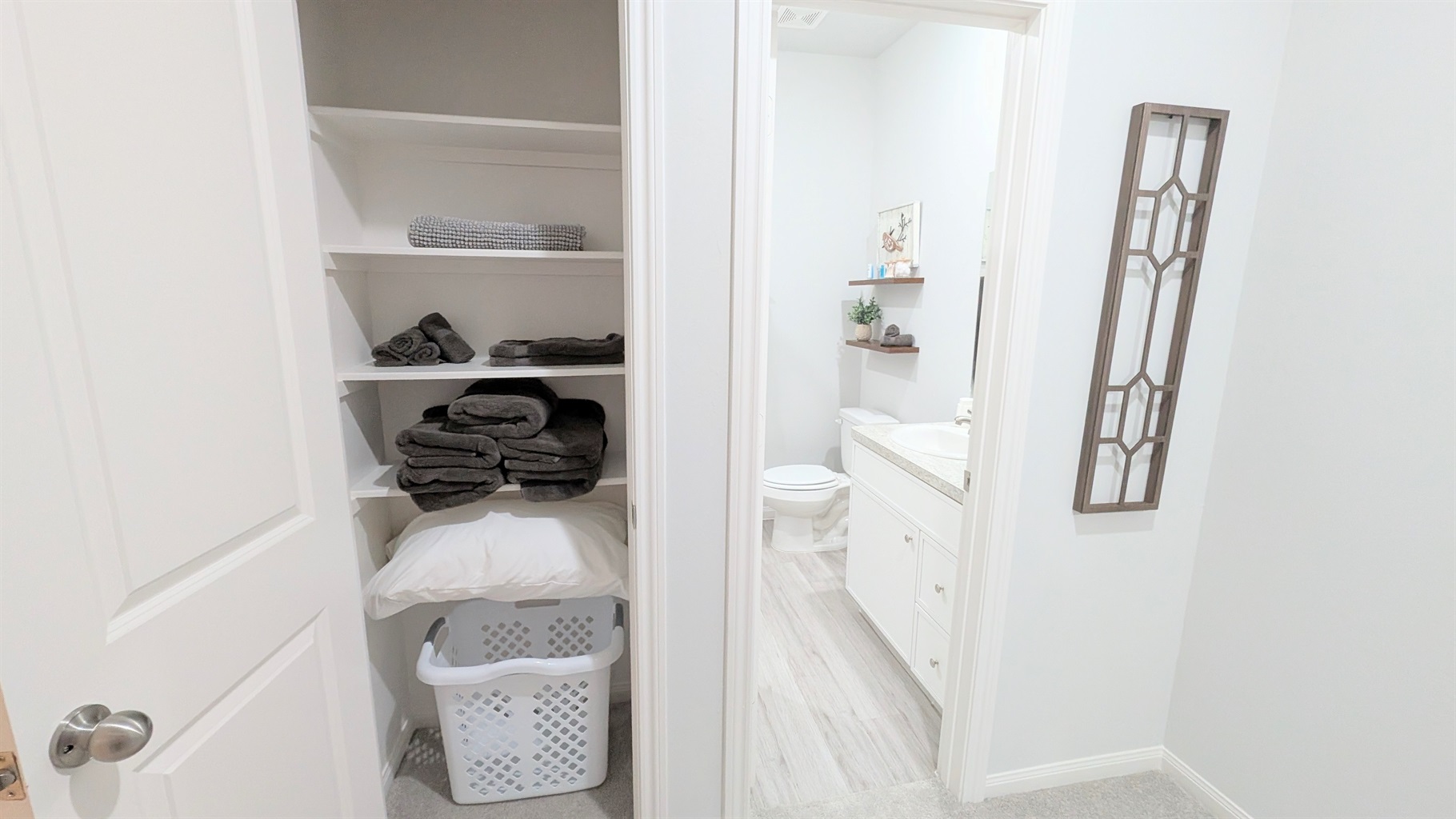 Large primary closet with extra pillows & towels, luggage racks, hangers and a laundry hamper. Bedding for the full sized sofa bed also included.