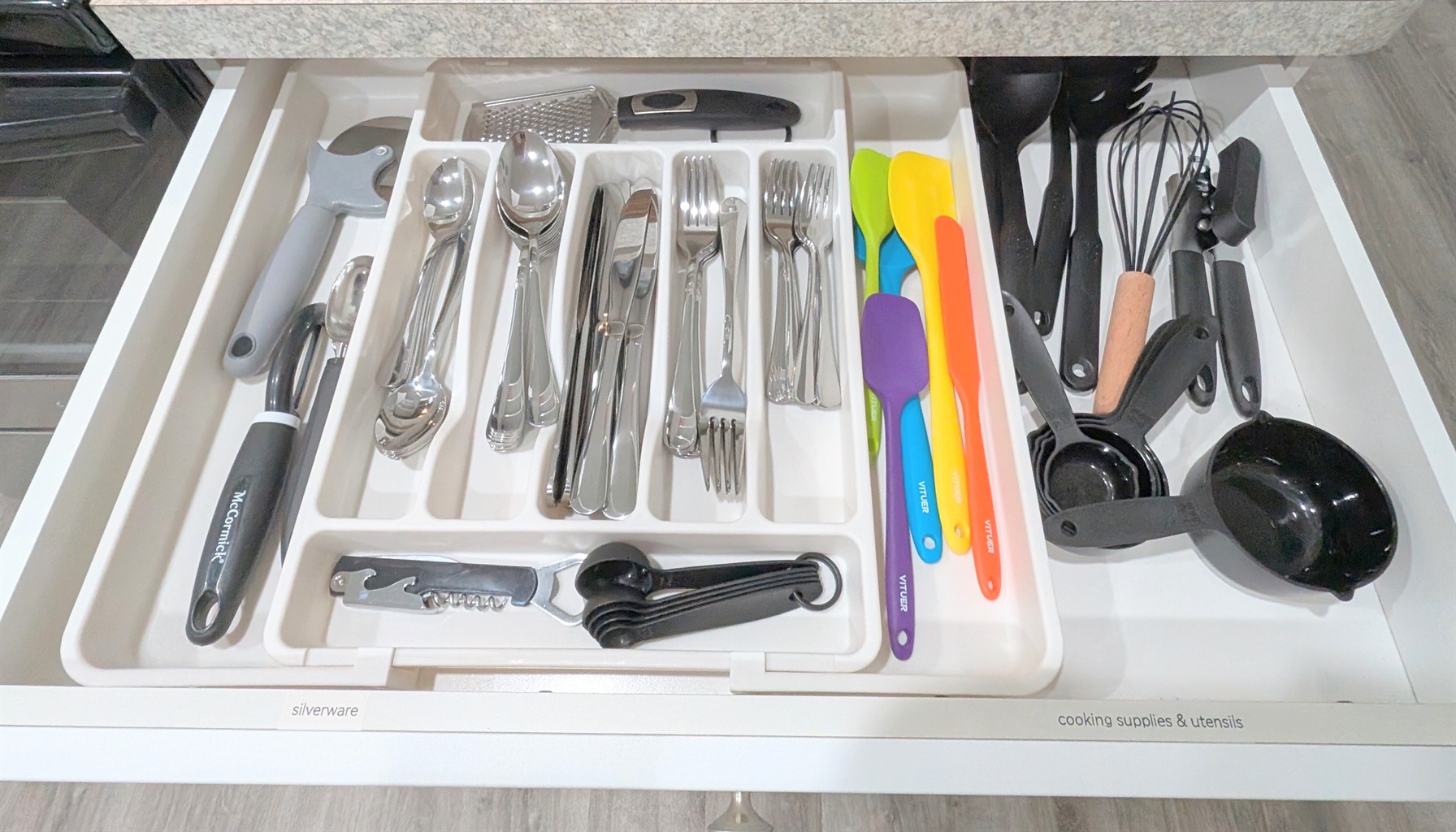 Full set of cooking supplies including pots, pans, & cooking utensils.