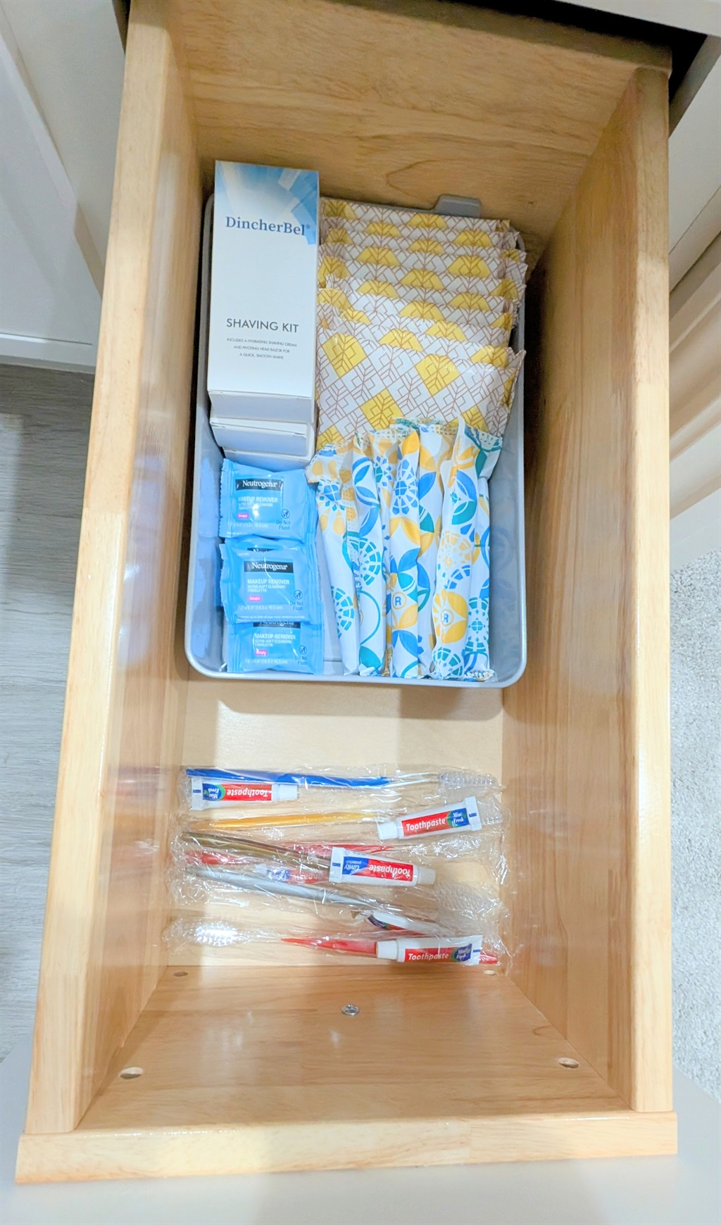Easy to access toiletries include travel shampoo, conditioner, and lotion, cotton swabs, cotton balls, and makeup remover wipes.